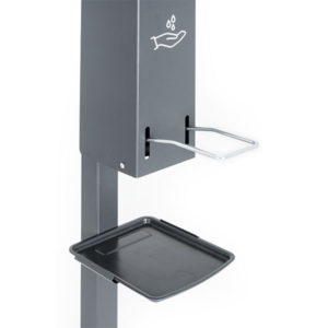 Schlanker Hygienespender für ca. 2.000 Dosierungen, hygienische Ellbogenbedienung (Hebel), praktische Tropfschale